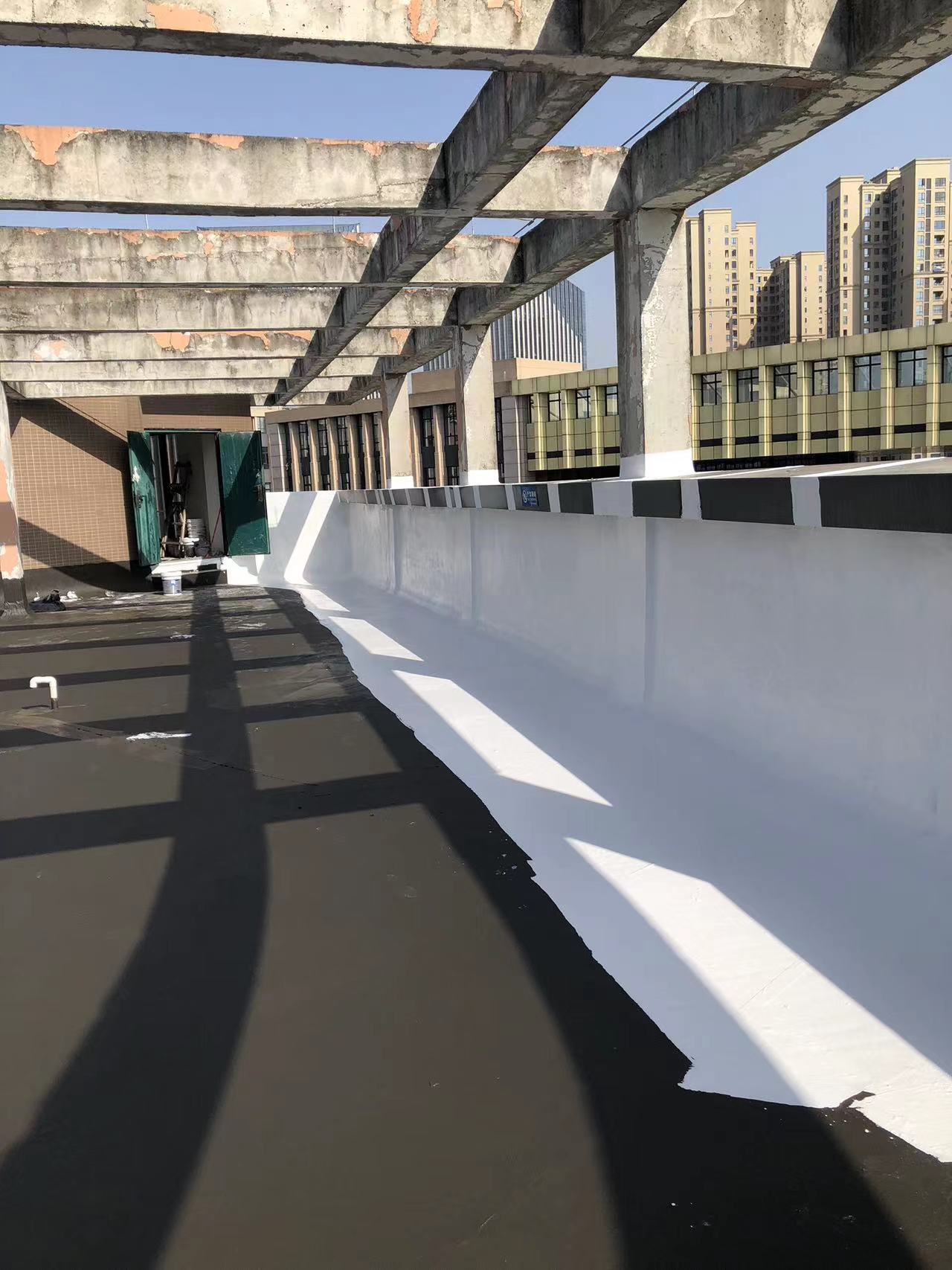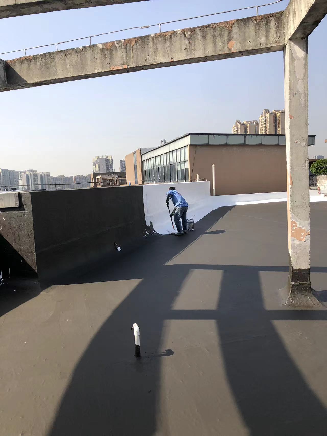 我公司現(xiàn)場施工工藝流程為:先將屋頂基層起殼易脫落的清理掉,破損部位水泥砂漿局部修補(bǔ),然后基層表面滿涂刷混凝土液體硬化劑進(jìn)行基層固化處理,這樣處理的好處是,后面做的防水層能夠與基層牢牢的粘結(jié)在一起;待混凝土液體硬化劑固化之后,屋頂?shù)牡孛婕皦γ嫒繚M涂刷蜀禹Ⅰ型聚合物水泥防水涂料然后滿鋪貼專用的縫織聚酯布再涂刷蜀禹Ⅰ型聚合物水泥防水涂料,待干后表面涂刷蜀禹Ⅰ型聚合物水泥防水涂料,等待干后表面再涂刷兩道SYR金屬屋面防水涂料涂層。施工完畢之后,等待施工的防水涂層干透之后,屋頂做閉水試驗(yàn)一星期后不漏水驗(yàn)收合格之后交驗(yàn)。