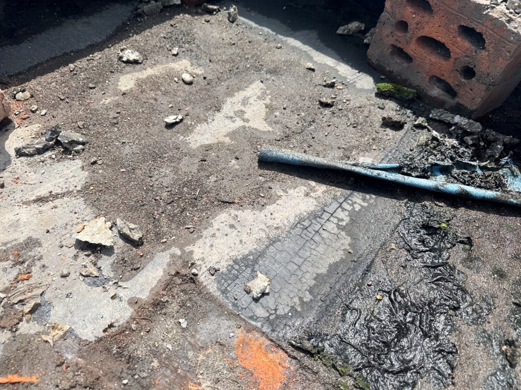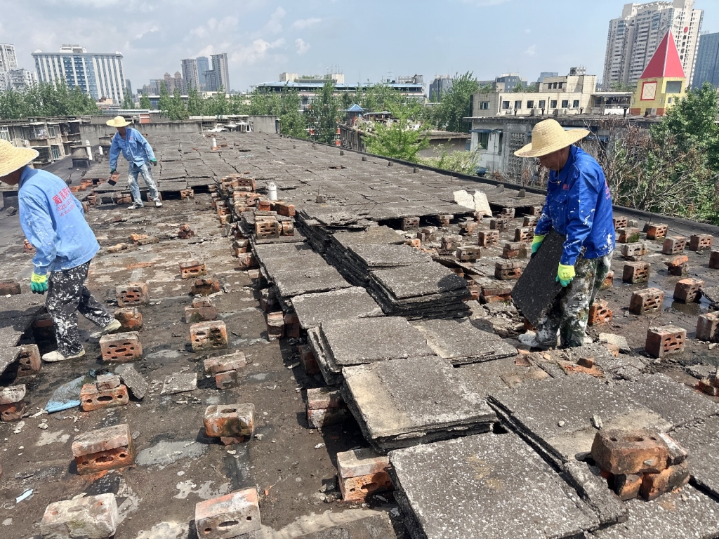 項目初期,蜀禹防水團隊首先對屋頂進行了全面的勘查與評估,隨后,施工隊伍小心翼翼地將屋頂表面的隔熱板逐一揭開,并將下方的磚塊逐一搬開,確保施工區(qū)域完全暴露且基層干凈無雜物。這一步驟雖然繁瑣,但為后續(xù)的防水處理奠定了堅實的基礎(chǔ)。