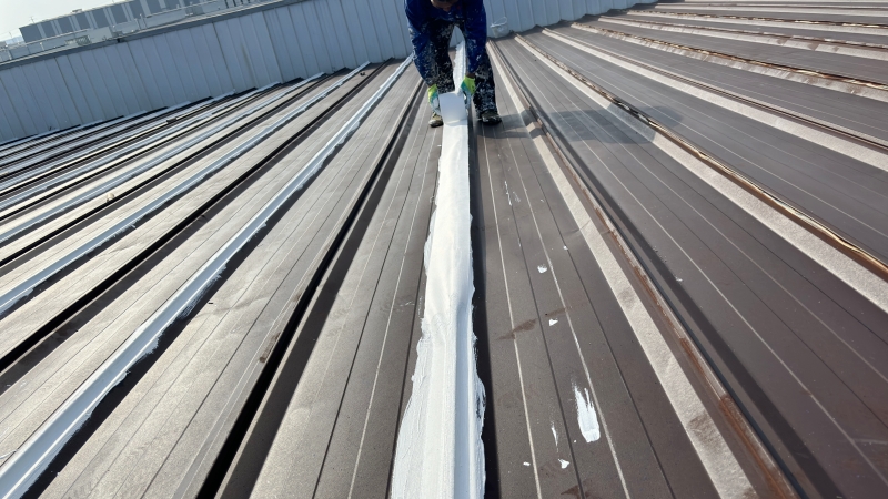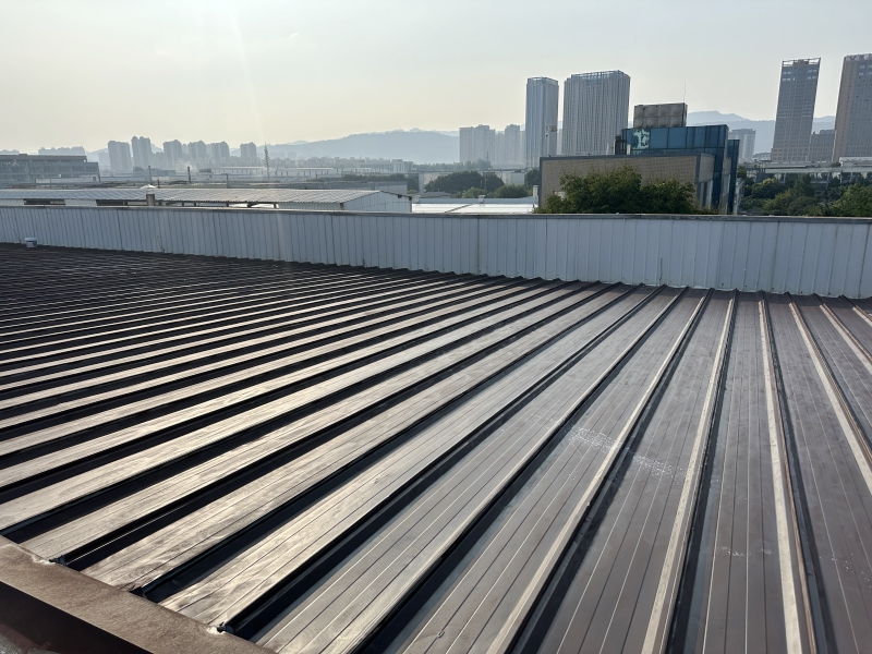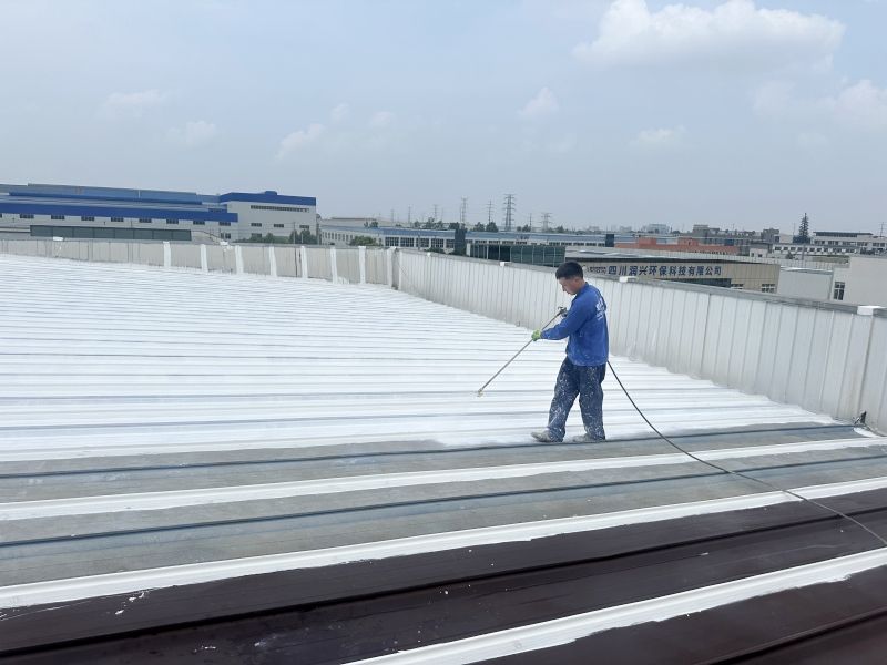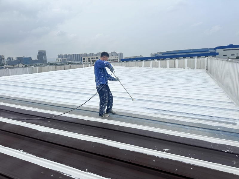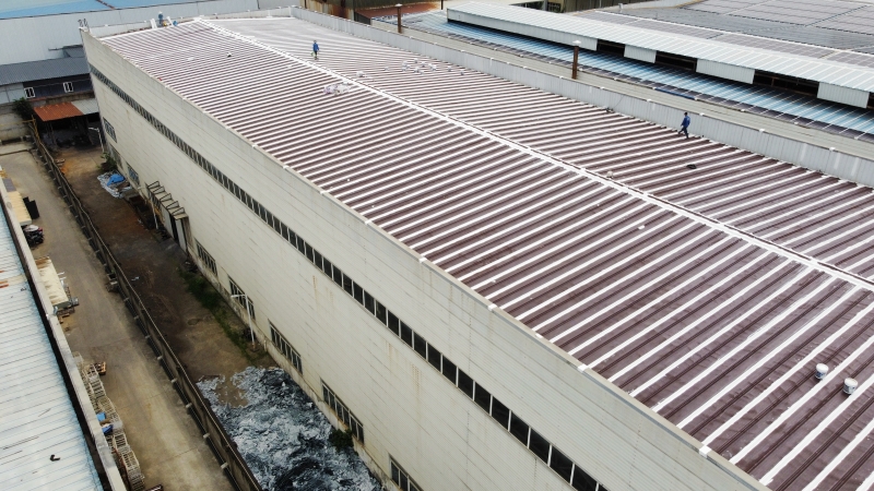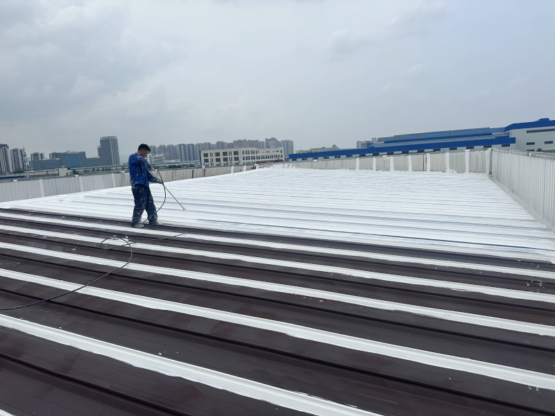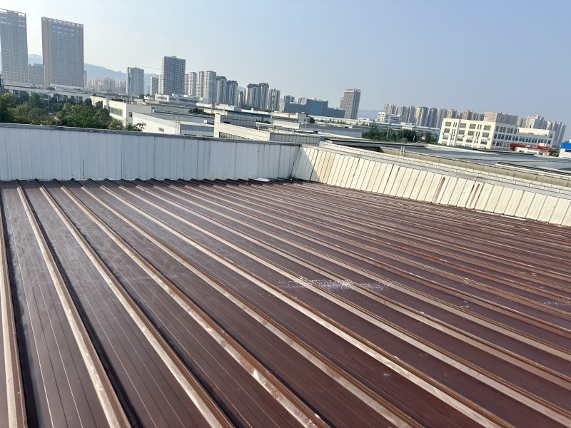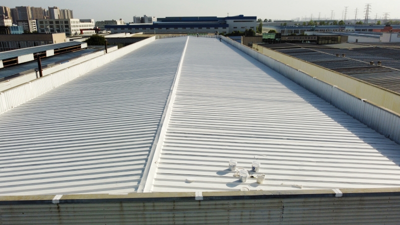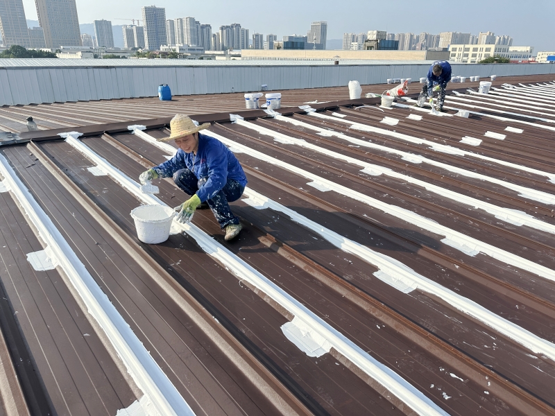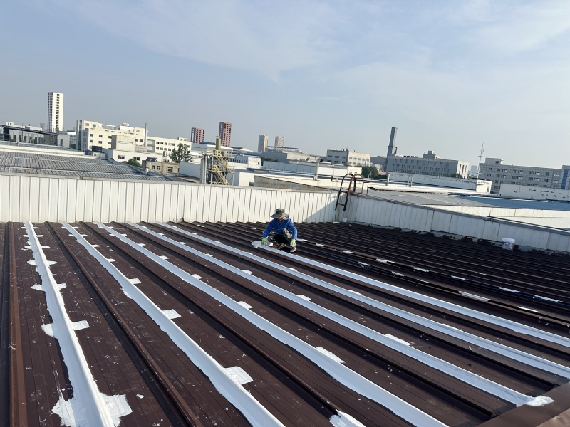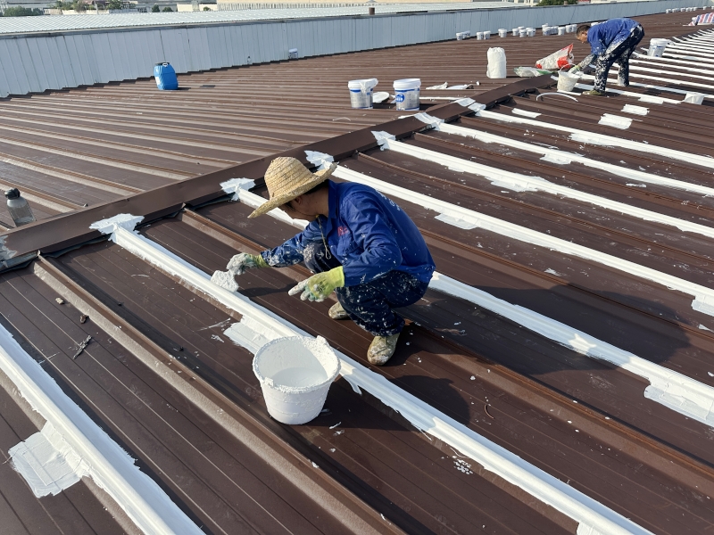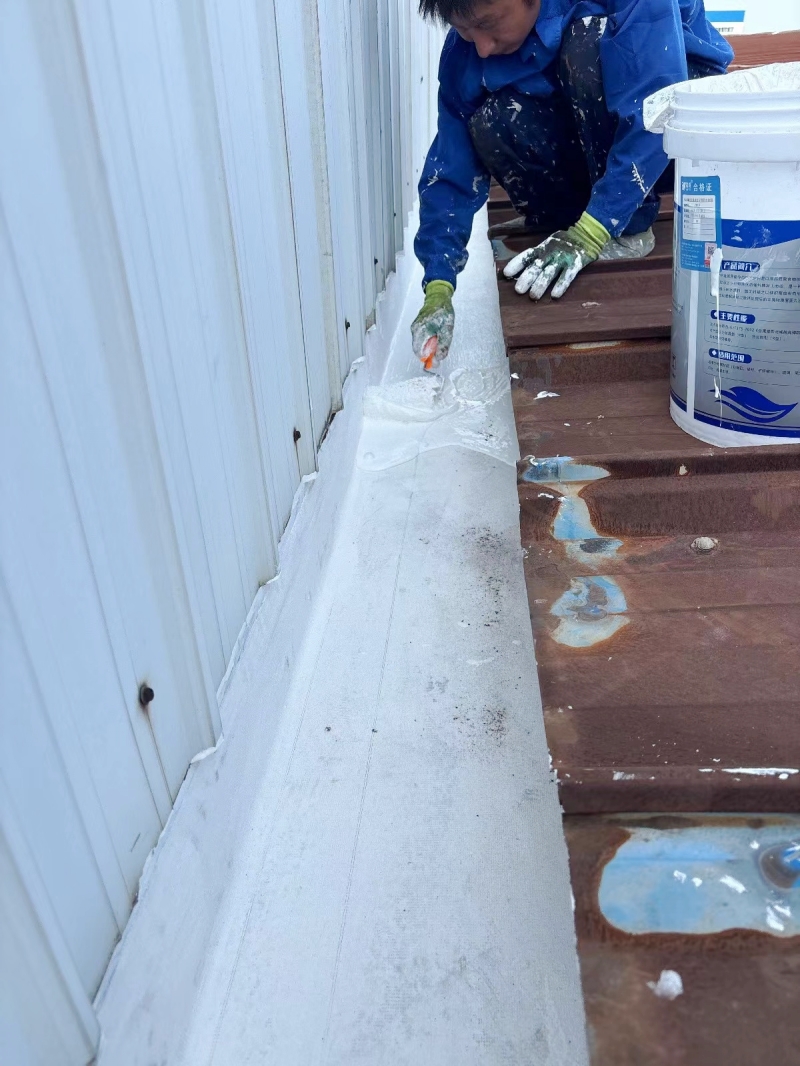 全面防水防腐翻新:整個彩鋼頂屋面滿涂SYR金屬屋面專用防水涂料進行防腐翻新,待干后再涂第二遍,形成雙重防護層,延長了彩鋼頂的使用壽命。