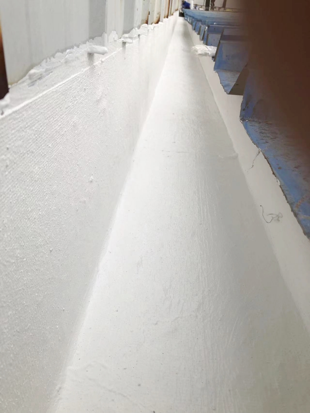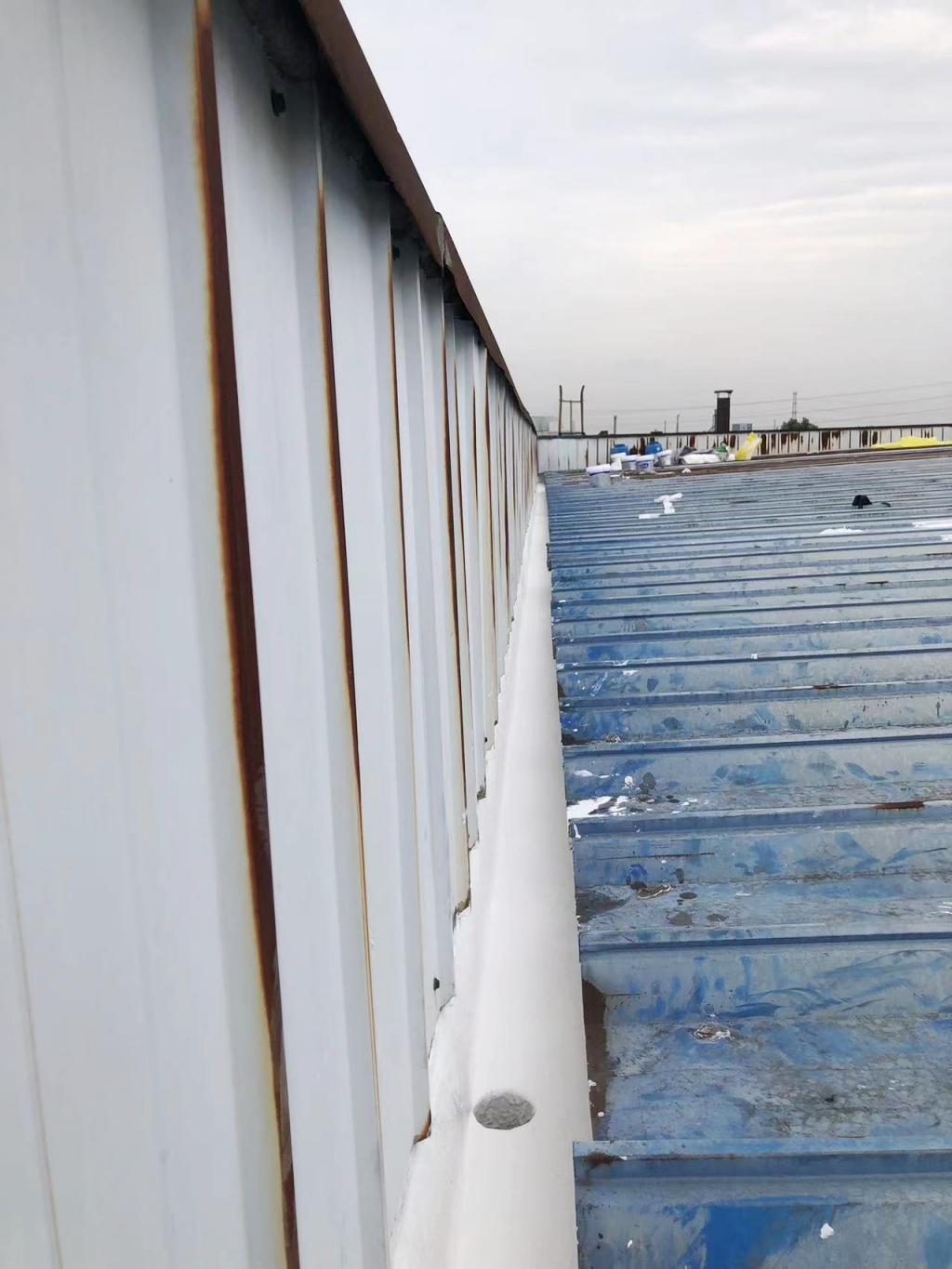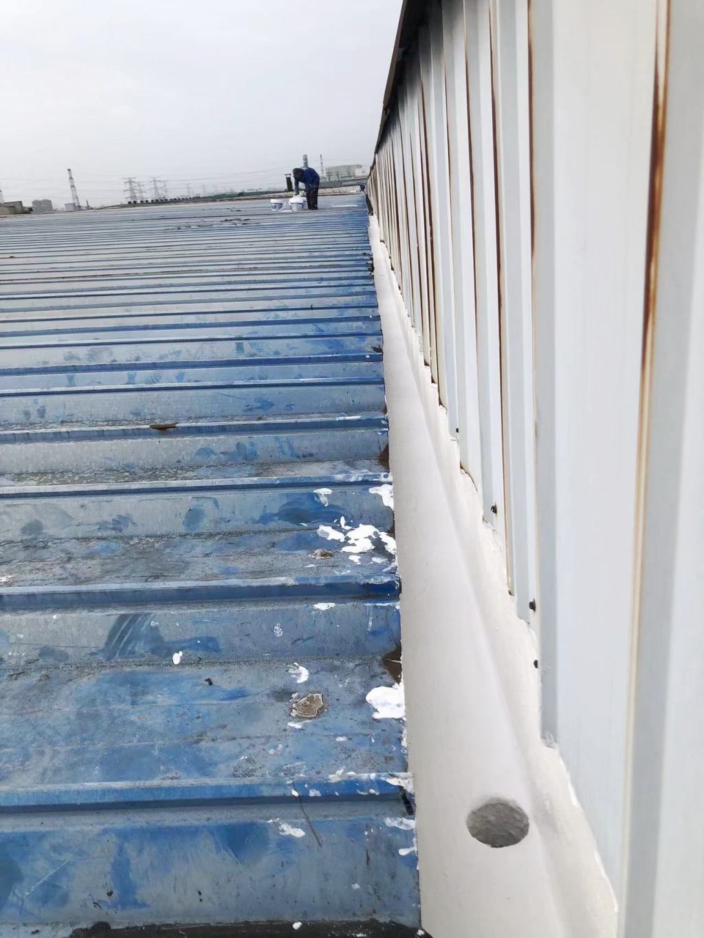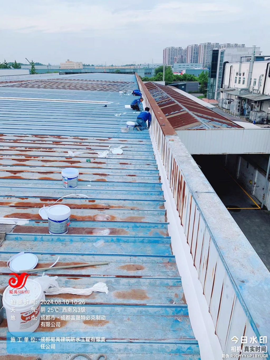 面對這一挑戰,成都蜀禹建筑防水工程有限責任公司迅速響應,組織專業團隊對現場進行了全面勘查,并制定了針對性的修復方案。方案的核心在于采用SYR金屬屋面專用防水涂料配合專用縫織聚酯布進行一布三涂的防水處理。這種處理方式不僅能夠有效解決現有滲漏問題,還能增強屋面的整體防水性能和耐久性,為廠房提供長期保護。