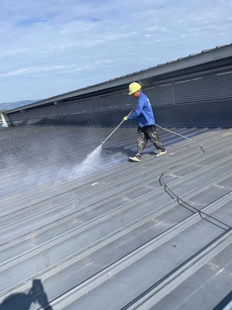 整體防腐翻新:完成關(guān)鍵部位處理后,對(duì)整個(gè)彩鋼頂屋面滿噴涂第一遍 SYR 金屬屋面專用防水涂料,實(shí)現(xiàn)全面防腐;待涂層干透后,再噴涂第二遍防水涂料,進(jìn)一步提升屋面的抗老化、抗風(fēng)雨侵蝕能力。